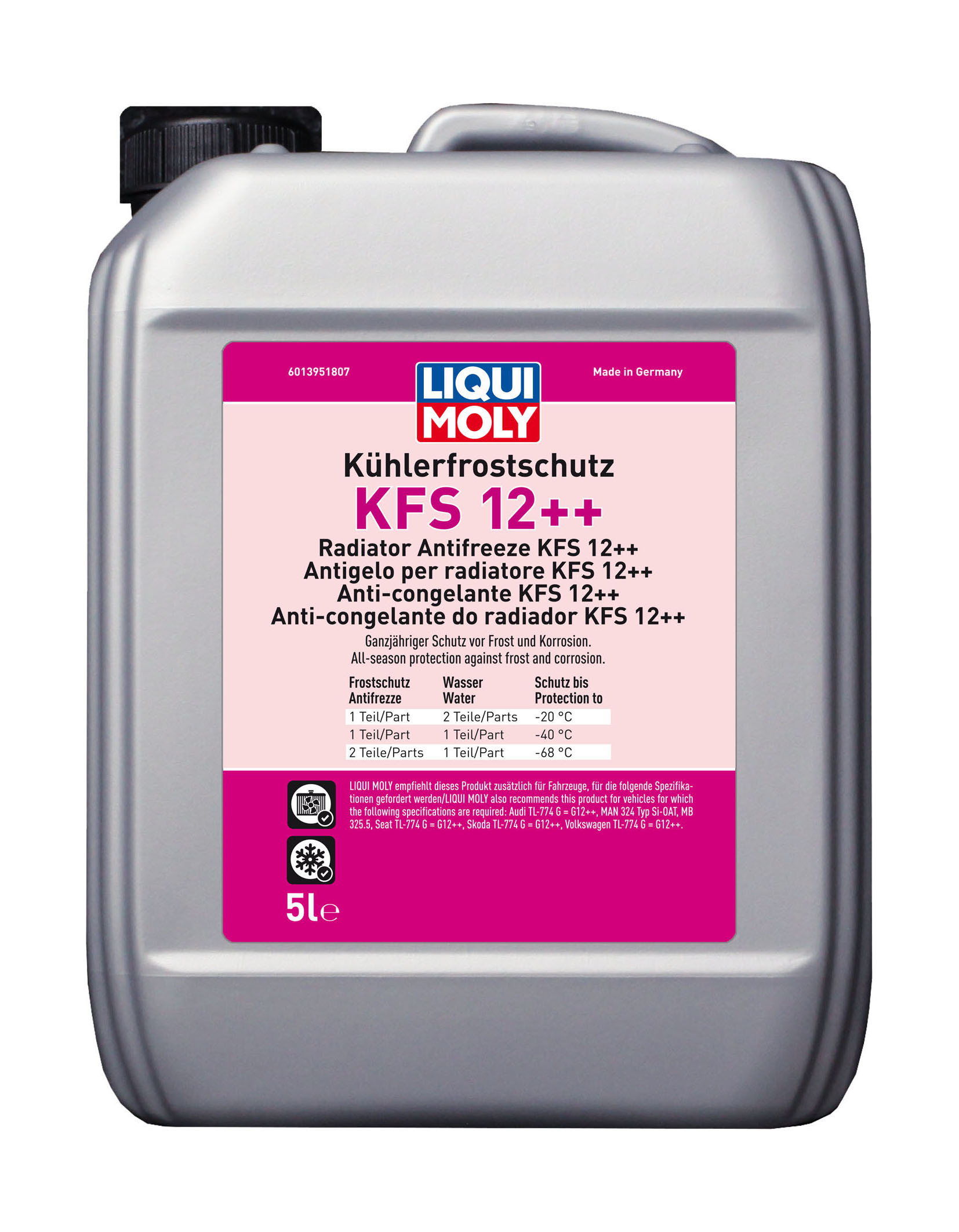 Für Motoren aus Gusseisen, Aluminium oder deren Kombination sowie Kühlsysteme mit Aluminium und/oder Kupferlegierungen. Speziell für Leichtmetallmotoren, bei denen ein besonderer Aluminiumschutz bei höheren Temperaturen verlangt wird. Für Pkw, Nfz, Busse, Landmaschinen sowie stationäre Motoren und Geräte, die einen Kühlerfrostschutz dieser Qualität fordern.